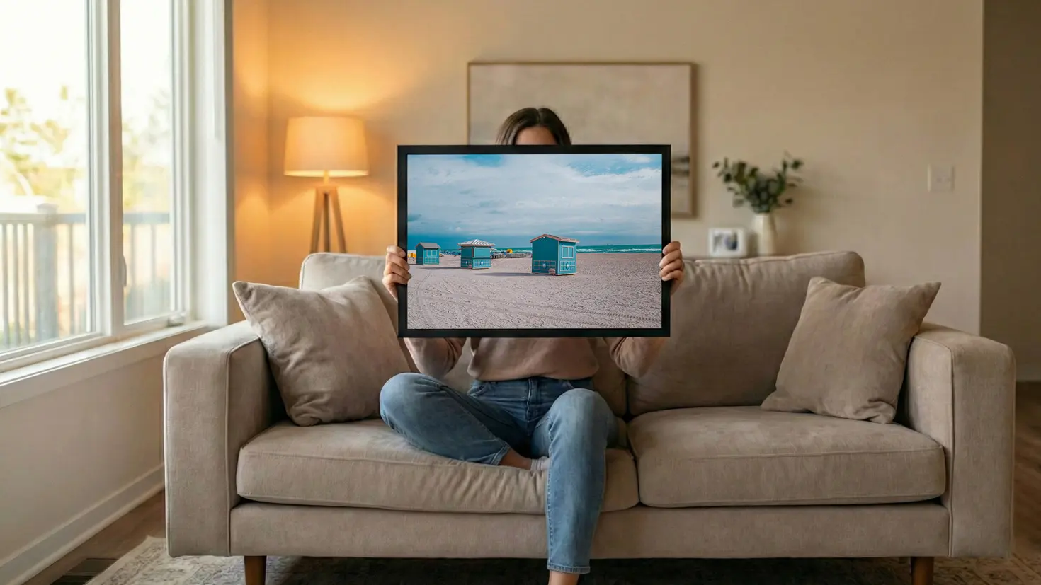 Gerahmtes Strand-Fotografie-Poster, gehalten von einer Frau auf einem Sofa im Wohnzimmer.